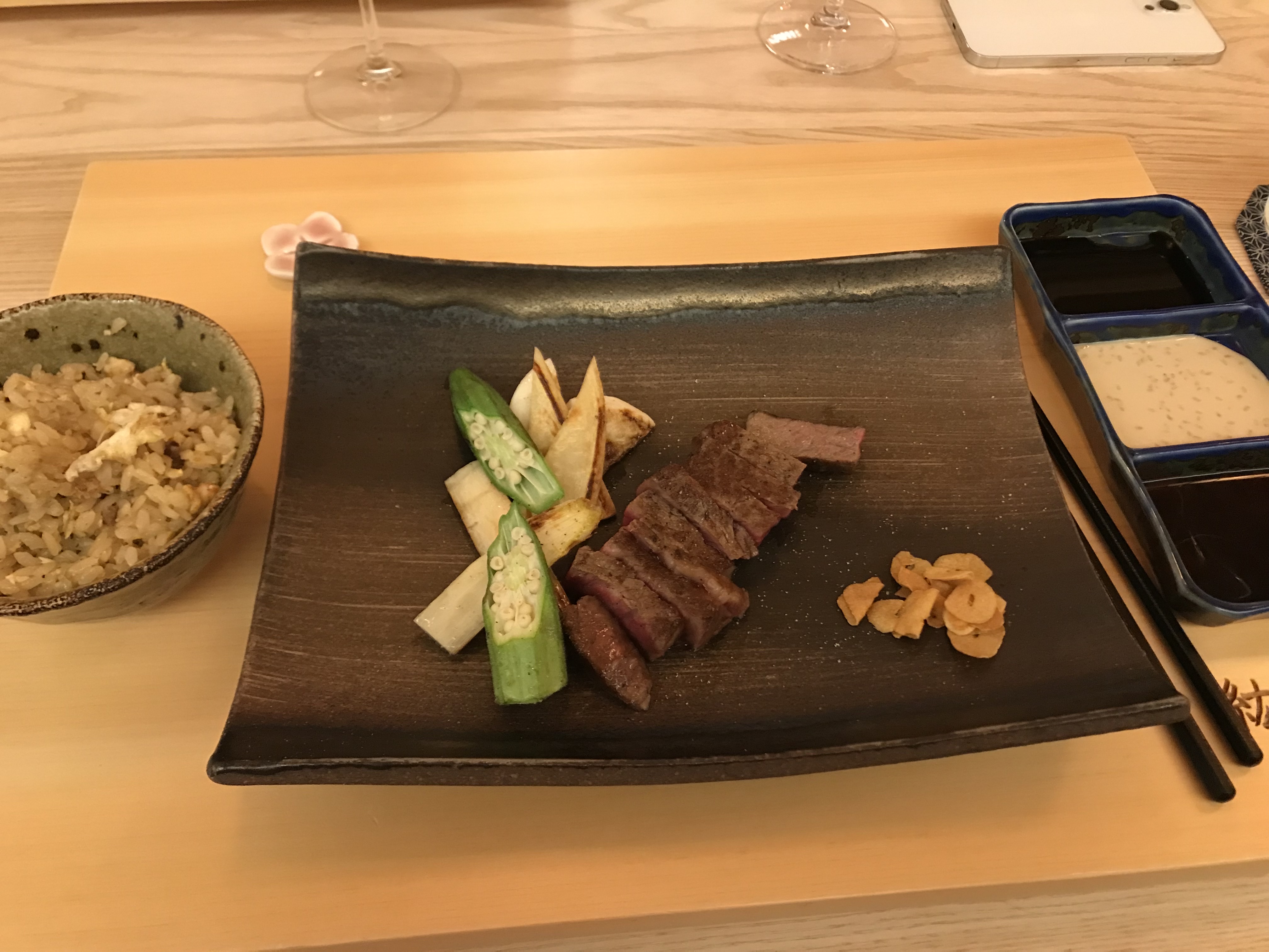 Tout était parfait ! L'art de recevoir à la japonaise ! 🥰 Tout est dans le détail. L'accueil, la vaisselle, la décoration signée d'un architecte japonais avec du bois précieux, et les deux plaques teppanyaki où officient chef Koji et son second. Le menu dégustation en 6 temps était un pur délice ! Nous reviendrons goûter le deuxième menu en 5 temps.